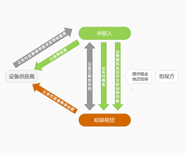產(chǎn)品定義:哈銀租賃根據(jù)承租人對租賃物和供貨人的選擇或認(rèn)可,向供貨人購買選定設(shè)備,提供給承租人使用,承租人根據(jù)雙方約定的利率、期限,按期足額支付租金的業(yè)務(wù)形式。租賃期滿,設(shè)備歸承租人所有。
